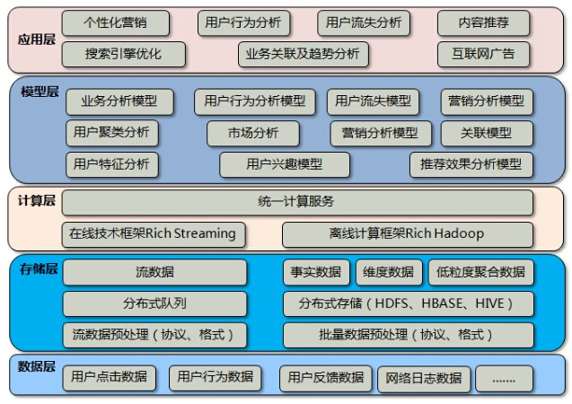 个性化推荐大数据方案框架分为五层, 分别是数据层,存储层,计算层,模型层, 应用层。模型层是整个个性化推荐的核心部分,为上层应用提供数据支撑。