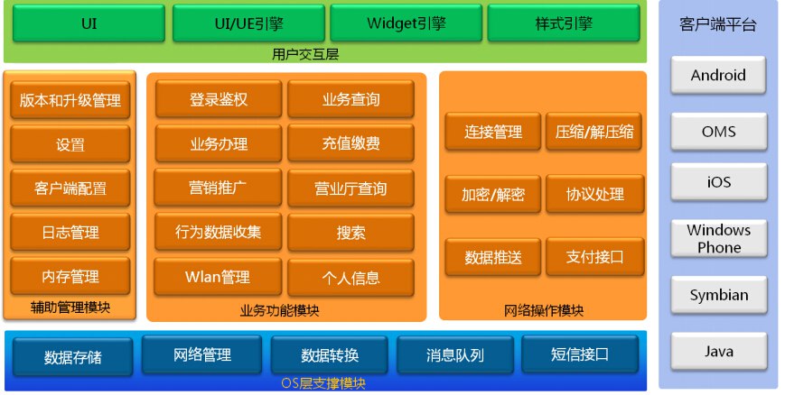 随着移动互联网应用环境不断改善,手机客户端应用逐渐丰富,功能日益强大。伴随 手机互联网业务的发展,手机上网的随时、随地性使其成为客户PC上网的重要补充。对于电信运营商,为了满足客户便捷性服务和个性化营销需求,手机客户端的 开发具有重要的战略意义和广阔的发展前景。 随着4G牌照发放,移动互联网迅猛发展,智能手机普及率提升,通过手机客户端提供服务,已成为浙江移动服务客户、开展营销的重要渠道。 架构与部署 总体架构 部署方式